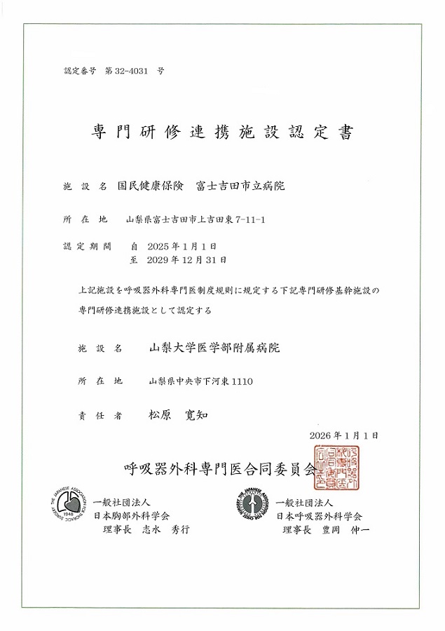 この度当院は呼吸器外科専門医合同委員会による専門研修連携施設に認定されました。